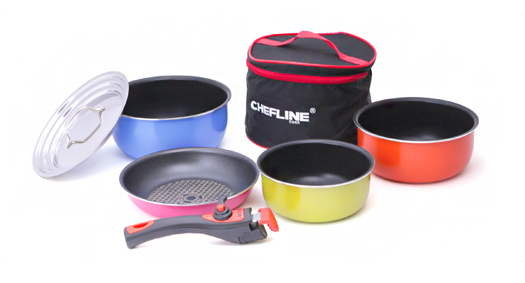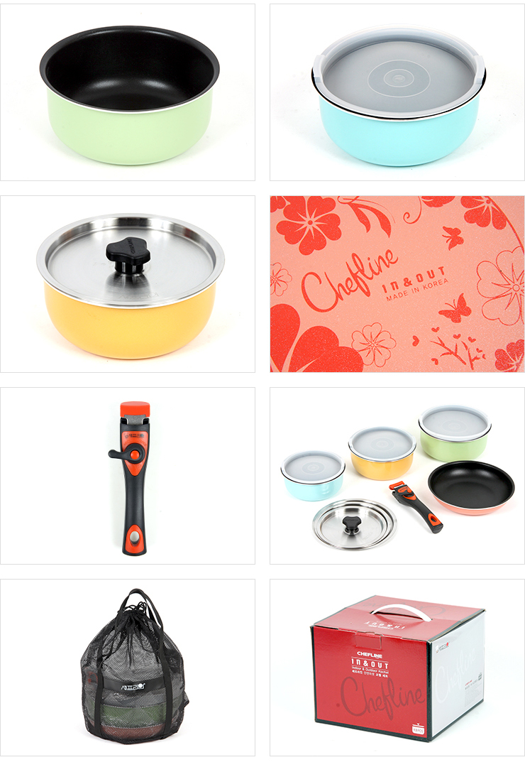 | Product description | Configuration | Casserole : 16cm Sauce Pot (orange) , 20cm Sauce Pot(Deep Blue) , 20cm Frypan (Pink) Cover : Multi-cover (16cm, 18cm, 20cm mixed use) Removable handles (Dual safety system) Carry-on bag |