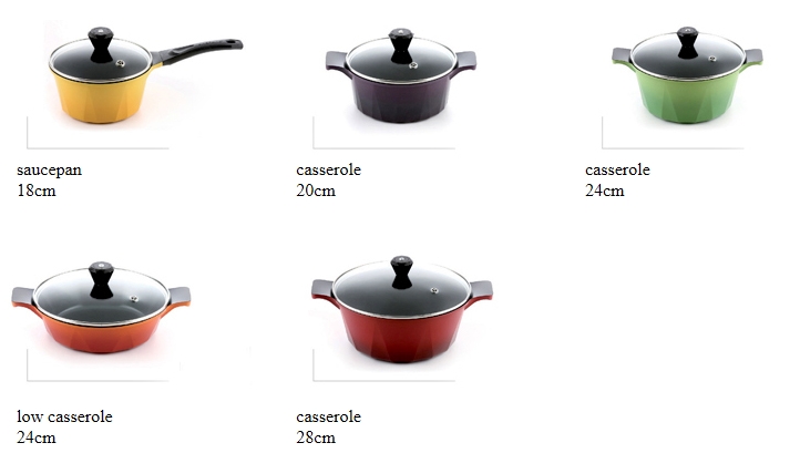 18cm saucepot, 20cm casserole, 24cm casserole, 24cm low casserole, 28cm casserole